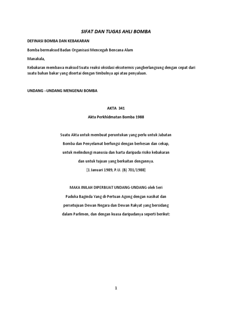 Badan yang menguatkuasa akta perkhidmatan bomba 1988. Pesuruhjaya Penyemak Undang-Undang Malaysia Di Bawah Kuasa Akta Penyemakan Undang-Undang 1968. Akta Perkhidmatan Bomba 1988 Akta 341 Peraturan Peraturan Dan Perintah Fire Services Act 1988 Act 341 Regulations And Order Hingga 1hb November 2001 Undang Undang. PENDAHULUAN Modul kursus AKTA 341 bagi pegawai Gred KB 19 ini adalah sebagai panduan dalam mengendalikan kursus kepada pegawai bomba tersebut dalam mela.
